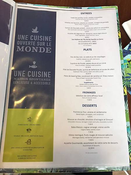 有前菜(ENTREES)、主餐(PLAT)、乳酪(FORMAGE)、甜點(DESSERTS)
