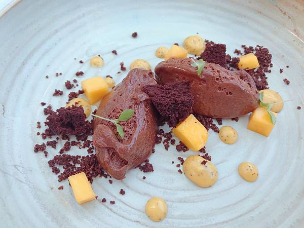 MOUSSE AU CHOCOLAT,EMULSION D'ESTRAGON ET STREUSEL