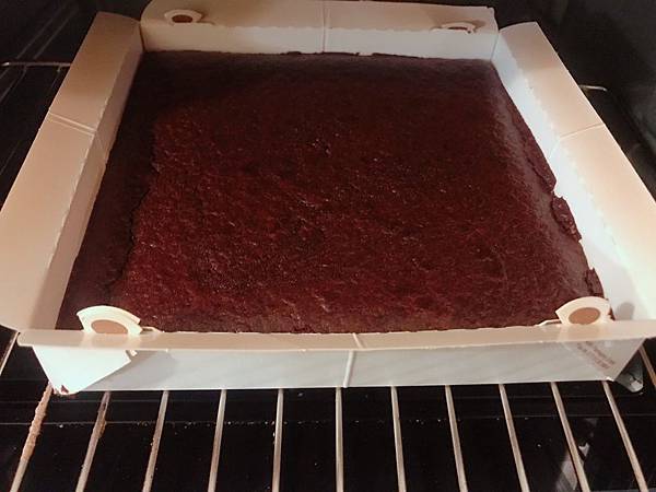 放入烤箱後,等18分鐘,用筷子或叉子戳戳蛋糕邊緣,觀察他是不是熟了