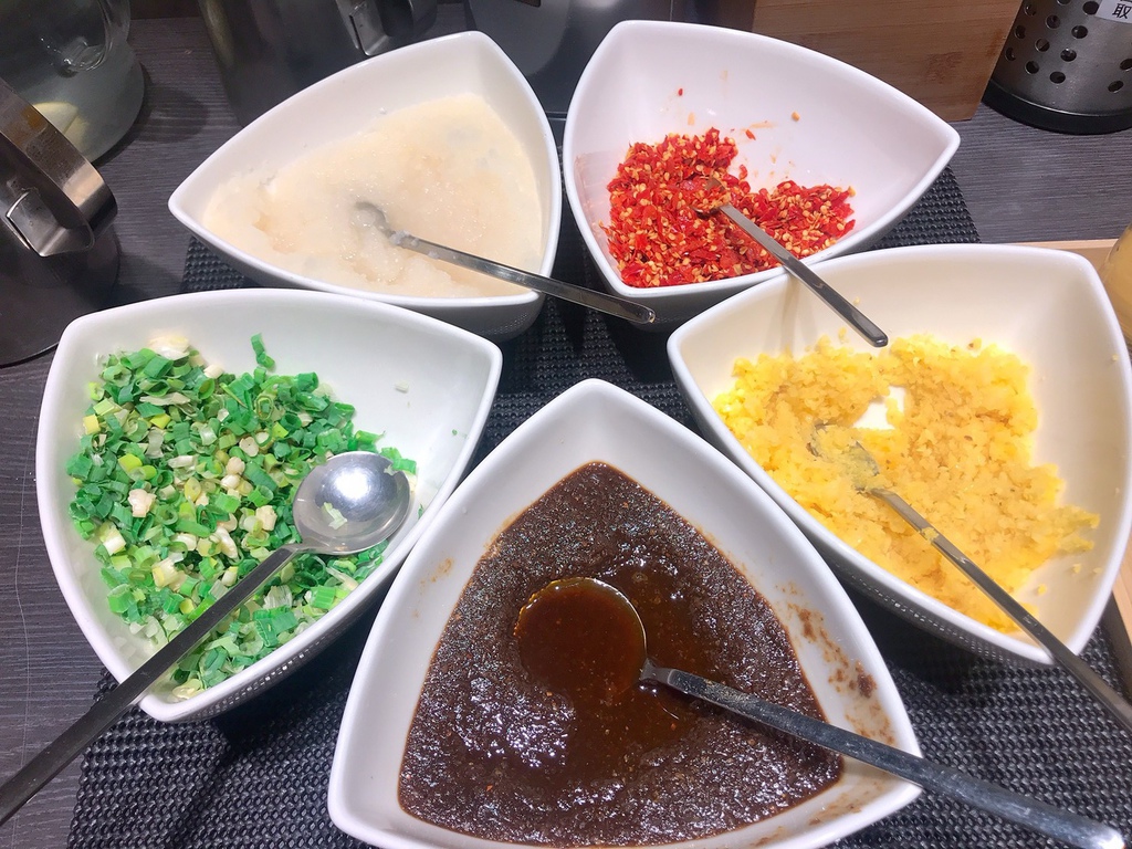 蘿蔔泥、辣椒、蔥花、蒜頭、沙茶醬都有