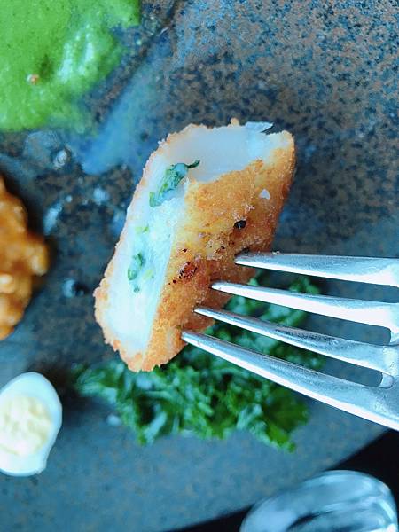 鬆軟好吃有點Q彈 搭配的是奶油蟹肉沾醬