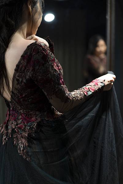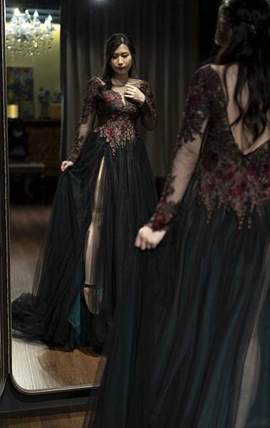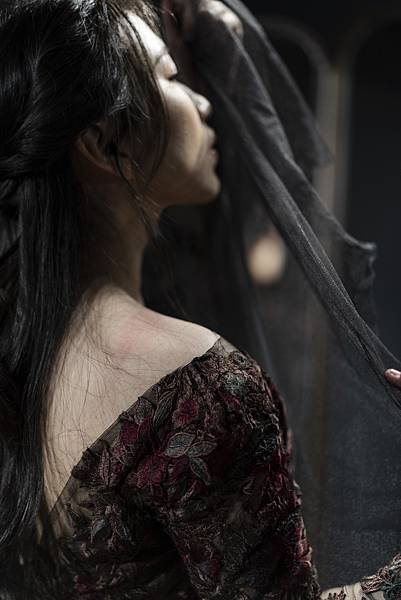 帶著古典玫瑰園的莊園感,配上深色的紗裙,帶有一絲迷離之感