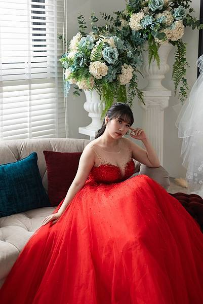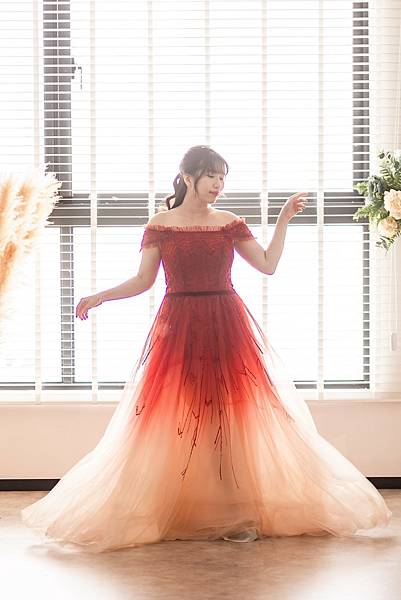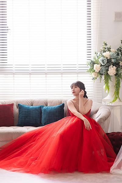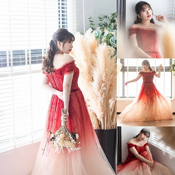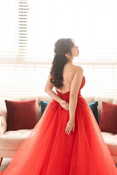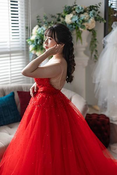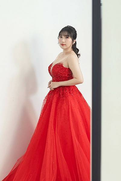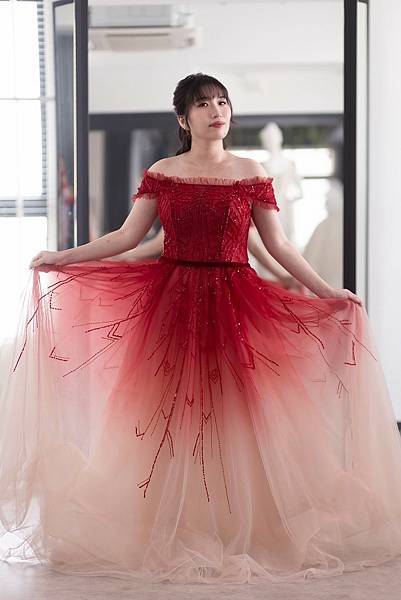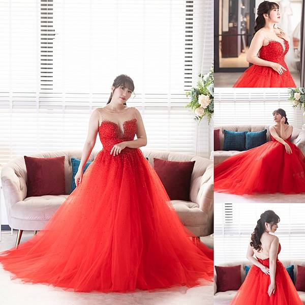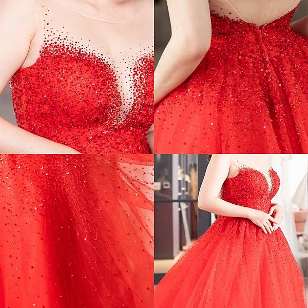 接下來是鑲滿珠鑽,熱情閃耀的 桃心鑽紅蓬裙禮服