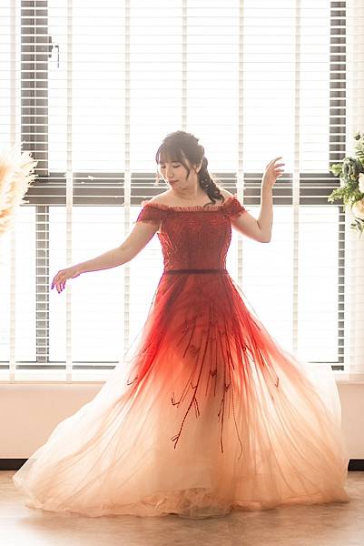 紅色硬紗如同熱情的火焰,環繞在身體周圍,燃燒著愛情的熱度