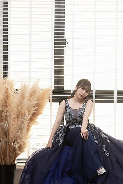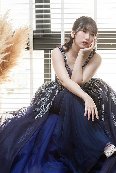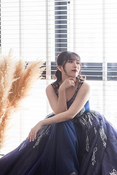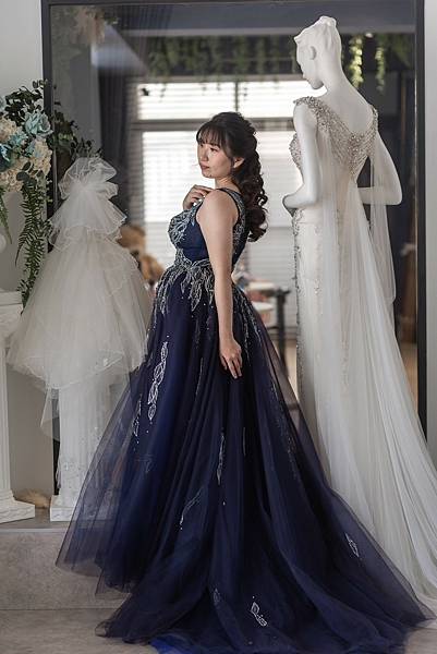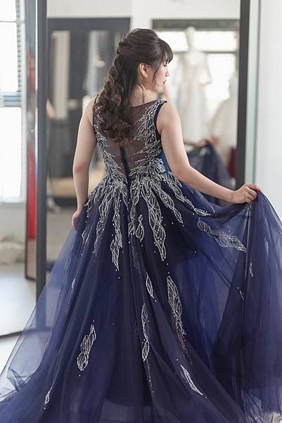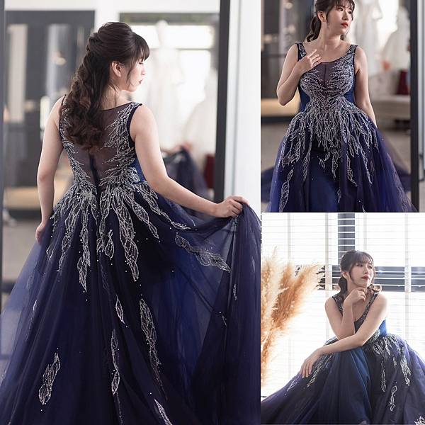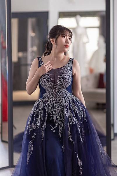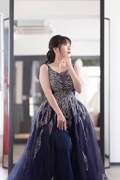 深藍色魚尾禮服猶如星空中最深沉的藍調,散發出一種神秘而優雅的氛圍